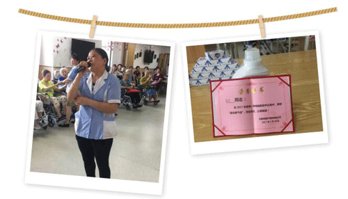 ![]() ▲二號選手吳亞平是來自梅園護理院食堂的一名員工,一首飽含深情的《最美不過夕陽紅》,贏得了評委和觀眾的陣陣喝彩,最終以平均分9.5的高分獲得本次比賽的一等獎。頒獎時,吳大叔已經(jīng)回到了自己的工作崗位,由其他同事代領(lǐng),為吳大叔的敬業(yè)精神點贊!