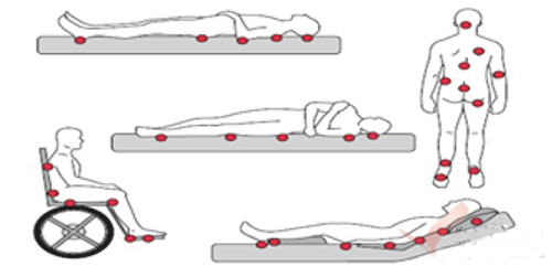 壓瘡常好發(fā)在骨突處(見附圖),但也可能發(fā)生在身體任何容易受到壓迫的位置,如:鼻胃管壓迫鼻孔、氧氣面罩壓迫臉頰、頸圈壓迫脖子等。