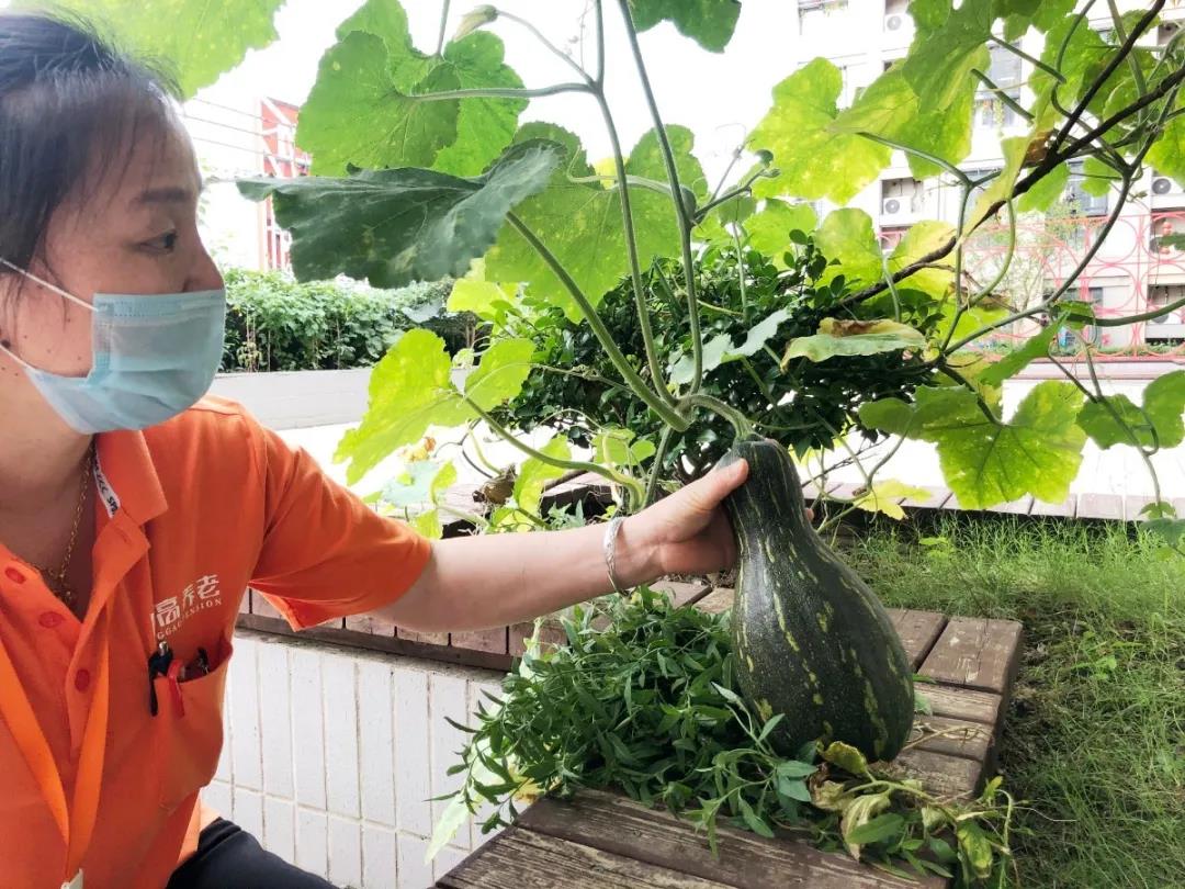時令到了七月,一株株瓜秧順著支架往上爬,瓜藤粗壯,葉子上還帶上了一層淡淡的白毛。辣椒、苦瓜、西紅柿、茄子……梅園朗高的菜園里要啥有啥。護理員阿姨趁著風和日麗,在菜園里采摘起來,“小暑過后就是真正的夏天了,機構(gòu)里很多老人都喜歡吃清新爽口的苦瓜,吃著自己種的蔬菜,老人們一定會很開心。”