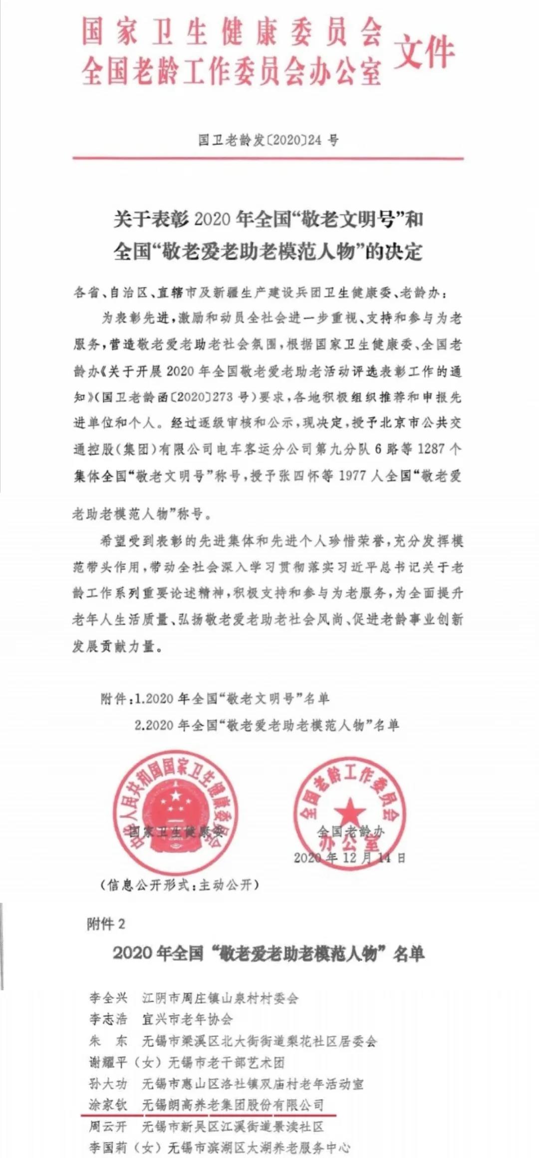 12月14日,國(guó)家衛(wèi)生健康委、全國(guó)老齡辦發(fā)布《關(guān)于表彰2020年全國(guó)“敬老文明號(hào)”和全國(guó)“敬老愛(ài)老助老模范人物”的決定》,授予1287個(gè)集體“敬老文明號(hào)”稱號(hào),授予1977人“敬老愛(ài)老助老模范人物”稱號(hào)。其中,無(wú)錫朗高養(yǎng)老集團(tuán)董事長(zhǎng)涂家欽被授予全國(guó)“敬老愛(ài)老助老模范人物”稱號(hào)。