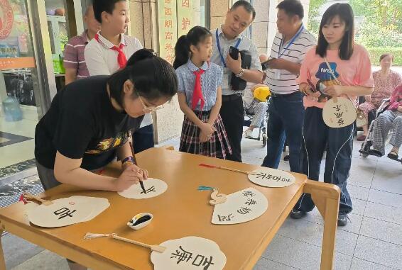 ![]() 活動現(xiàn)場,學(xué)生以筆墨寄情,在扇子上書寫出一幅幅不同風(fēng)格的書法作品。她將自己制作的文創(chuàng)作品送給長者,書寫著“孝”“?!钡男∩茸釉陂L者的手中顯得精致小巧,老人們看著手中的扇子格外喜歡,這也表達了孩子們對長者的祝福與關(guān)愛,現(xiàn)場呈現(xiàn)一片其樂融融的溫馨之景。